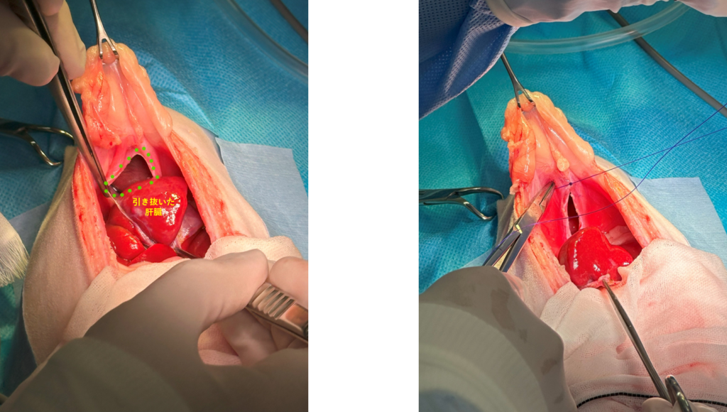 ヘルニア孔をみつけて胸の中に入り込んでいる肝臓を引き出します。