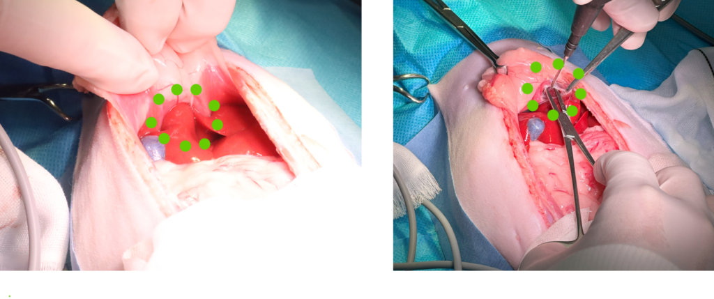 緑の点線が囲っている場所が横隔膜にあいた穴から肝臓が入り込んでいるところです。鉗子を使って周囲の膜をはがしていきます。
