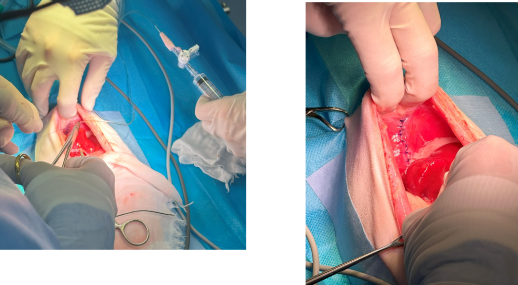 肝臓を戻したらヘルニア孔を縫合して閉じていきます。