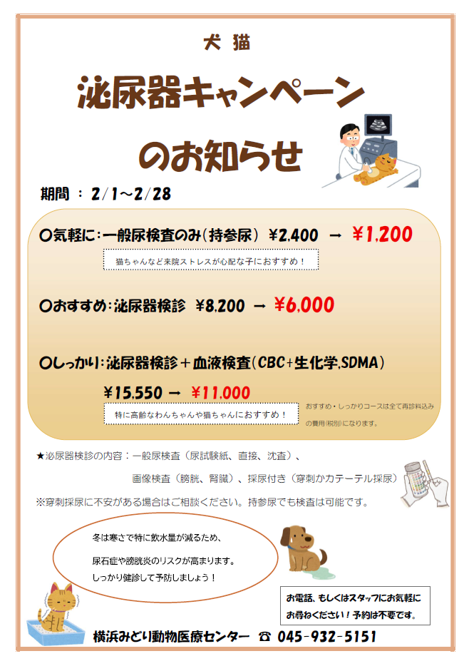 冬は寒くなり飲水量も減るため、泌尿器のトラブルが増える季節です。尿石症など早期発見にもつながる可能性があります。日頃から定期的な尿検査を行い、わんちゃんやねこちゃんの泌尿器トラブル予防していきましょう!