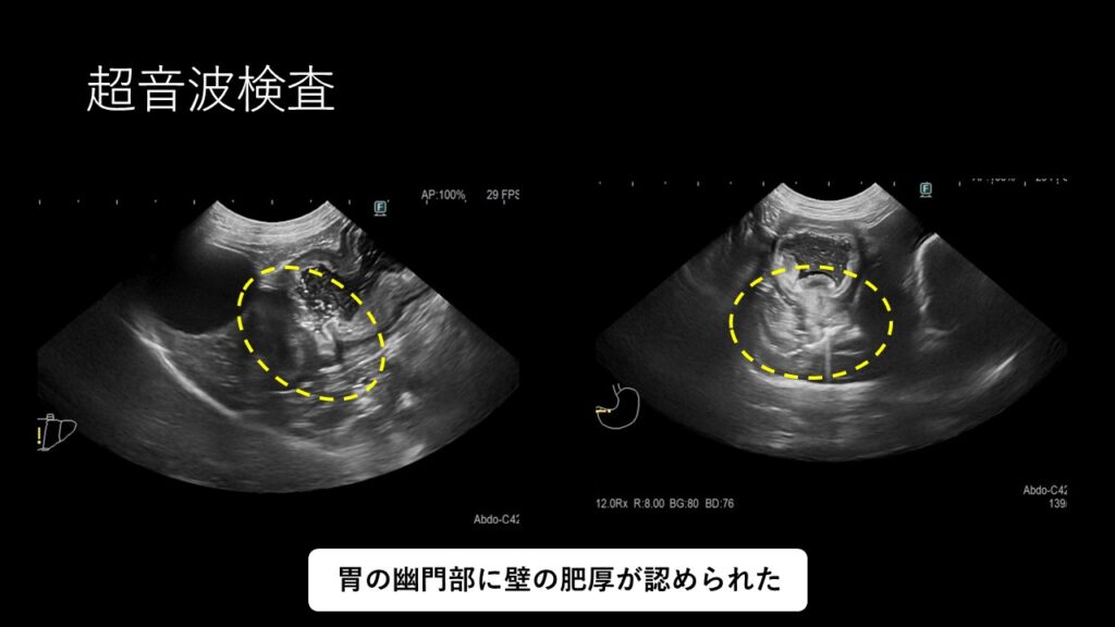 超音波検査の結果、胃の幽門部に壁の肥厚が認められました。