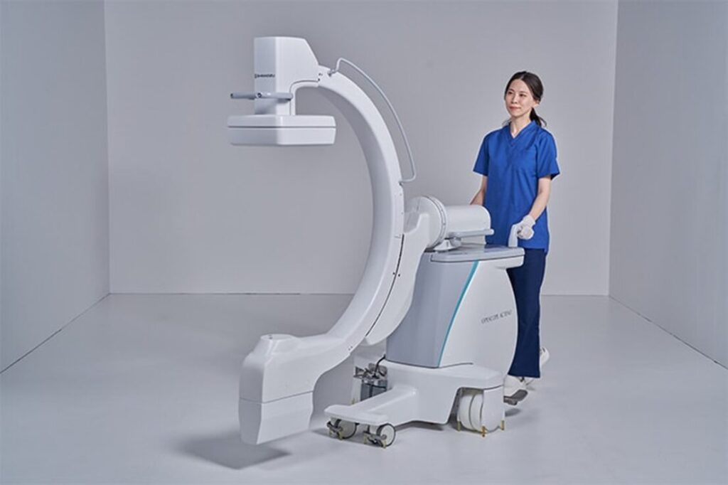 Cアームとは画像のようにアルファベットの”Cの字型”をした移動式のX線透視診断装置になります。この機器は通常のレントゲン撮影に加えて透視(レントゲン画像を動画で映し出す)機能を持ち、リアルタイムでのレントゲン画像を描出することができる外科用レントゲン装置です。